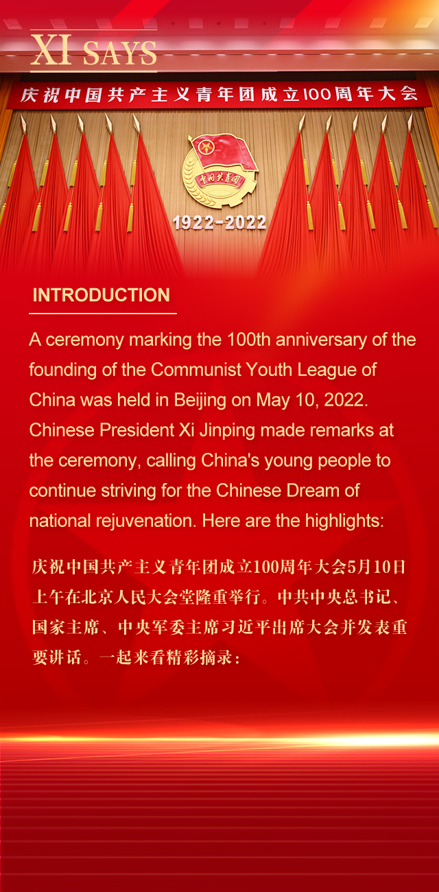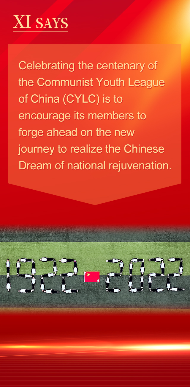 庆祝中国共产主义青年团成立100周年,就是要激励广大团员青年在实现中华民族伟大复兴中国梦的新征程上奋勇前进。