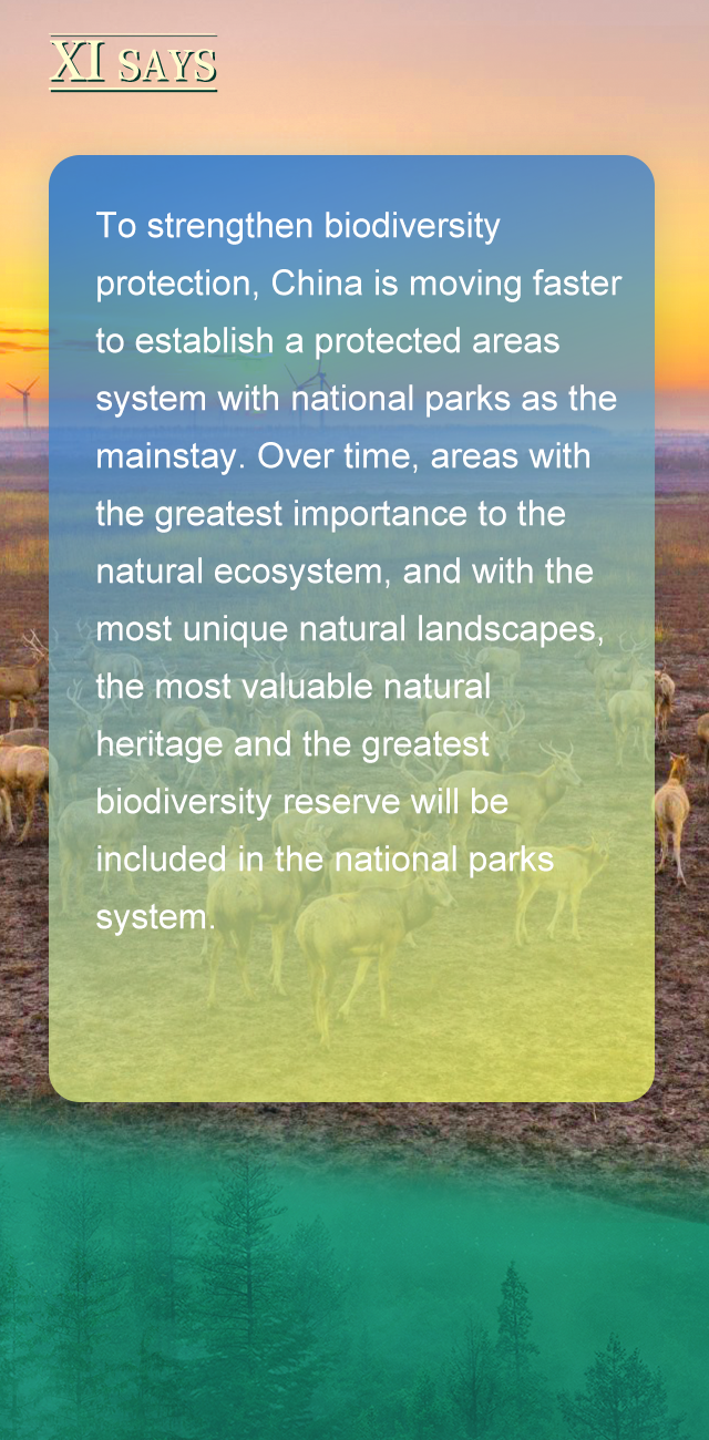 为加强生物多样性保护,中国正加快构建以国家公园为主体的自然保护地体系,逐步把自然生态系统最重要、自然景观最独特、自然遗产最精华、生物多样性最富集的区域纳入国家公园体系。