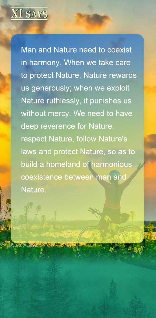 人与自然应和谐共生。当人类友好保护自然时,自然的回报是慷慨的;当人类粗暴掠夺自然时,自然的惩罚也是无情的。我们要深怀对自然的敬畏之心,尊重自然、顺应自然、保护自然,构建人与自然和谐共生的地球家园。