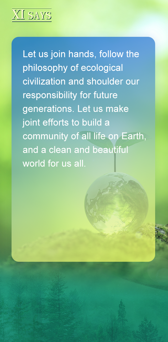 让我们携起手来,秉持生态文明理念,站在为子孙后代负责的高度,共同构建地球生命共同体,共同建设清洁美丽的世界!