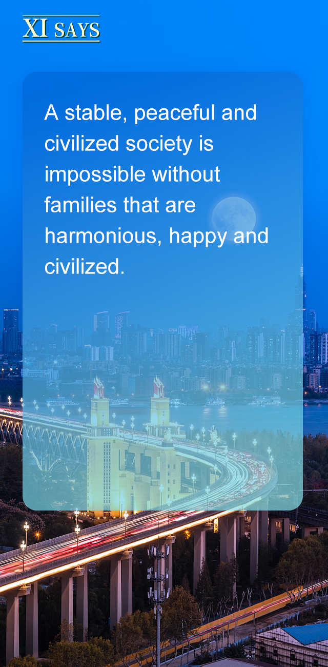 家庭和睦则社会安定,家庭幸福则社会祥和,家庭文明则社会文明。