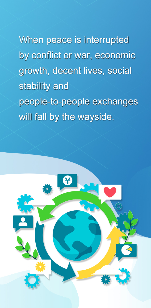 没有和平,冲突不断甚至战火纷飞,经济增长、民生改善、社会稳定、人民往来等都会沦为空谈。