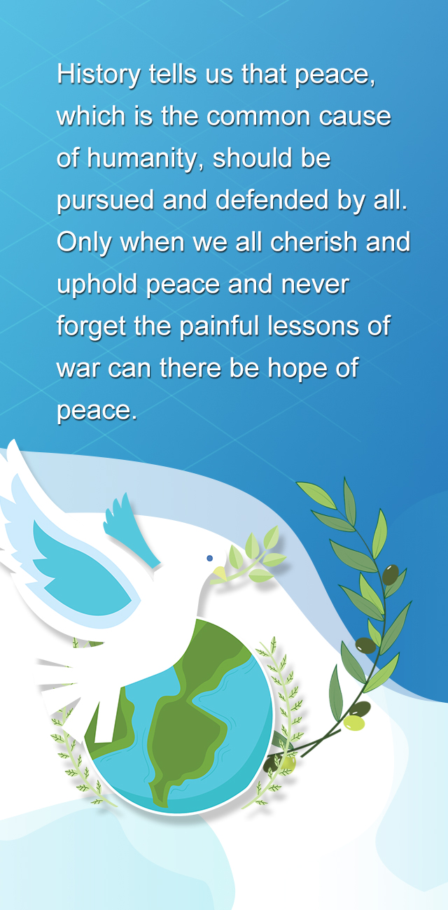 历史告诉我们,和平是人类共同事业,需要各方共同争取和维护。只有人人都珍爱和平、维护和平,只有人人都记取战争的惨痛教训,和平才有希望。