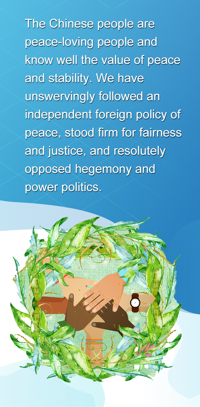 中国人民热爱和平,深知和平安宁的珍贵,始终奉行独立自主的和平外交政策,主持公道,伸张正义,坚决反对霸权主义和强权政治。