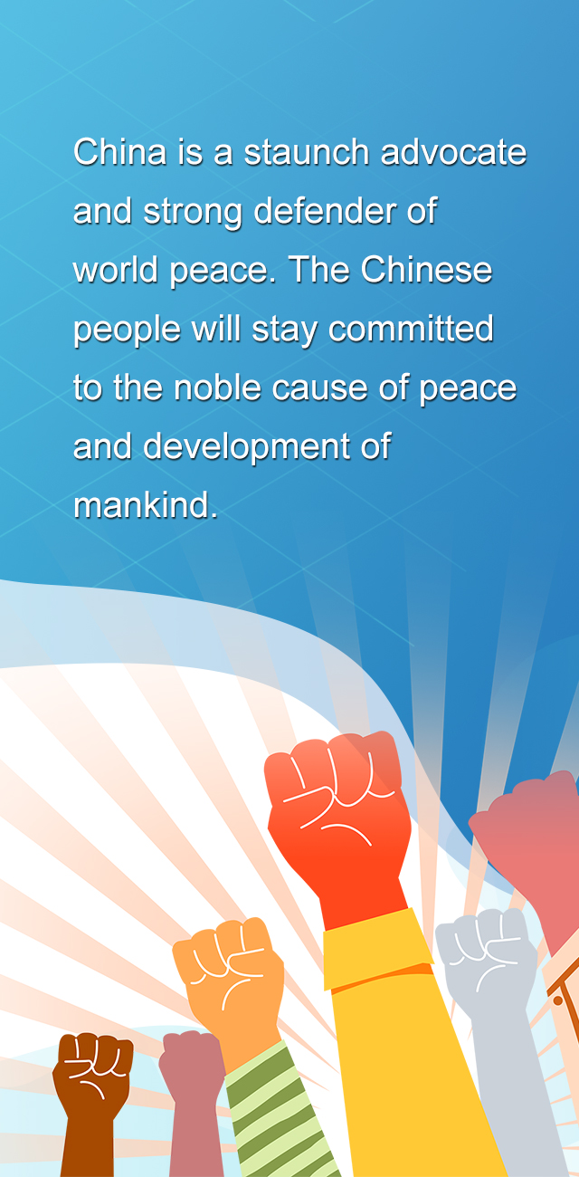 今天的中国,是世界和平的坚决倡导者和有力捍卫者,中国人民将坚定不移维护人类和平与发展的崇高事业。