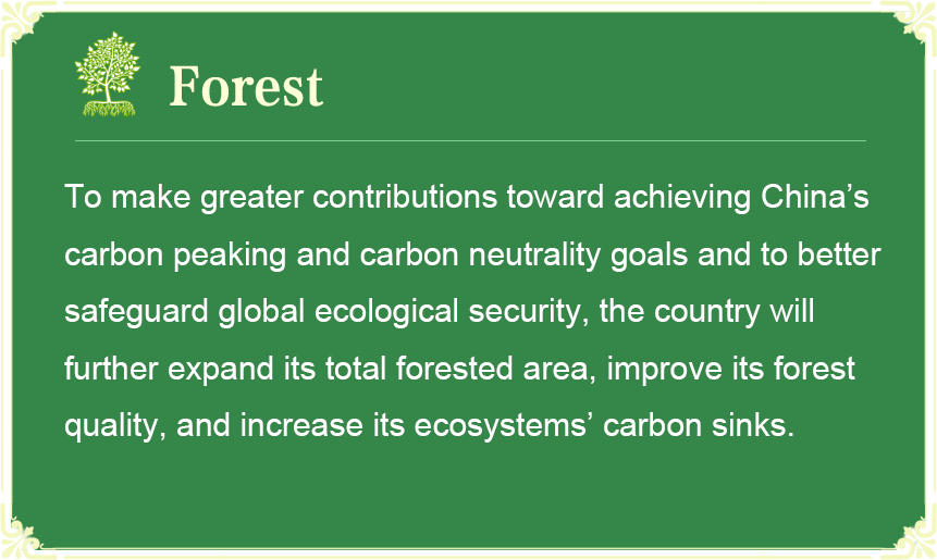 增加森林面积、提高森林质量,提升生态系统碳汇增量,为实现我国碳达峰碳中和目标、维护全球生态安全作出更大贡献。