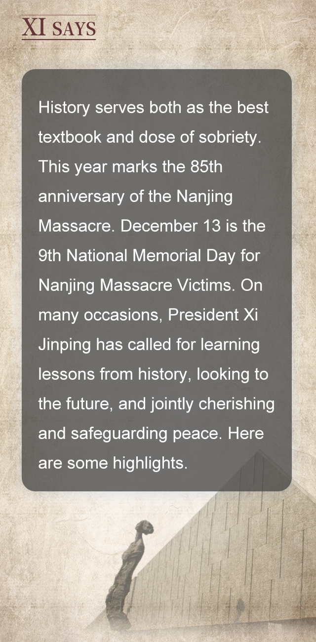 历史是最好的教科书,也是最好的清醒剂。今年是南京大屠杀惨案发生85周年。12月13日也是我国第九个法定的南京大屠杀死难者国家公祭日。习近平总书记多次强调要以史为鉴、珍爱和平。让我们一起学习,从历史中汲取前行力量。