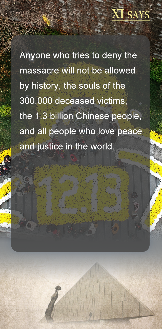 任何人要否认南京大屠杀惨案这一事实,历史不会答应,30万无辜死难者的亡灵不会答应,13亿中国人民不会答应,世界上一切爱好和平与正义的人民都不会答应。