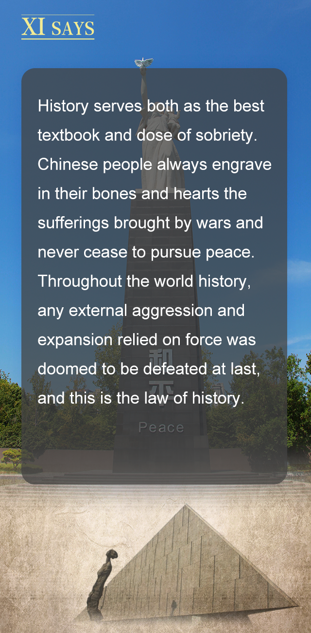历史是最好的教科书,也是最好的清醒剂。中国人民对战争带来的苦难有着刻骨铭心的记忆,对和平有着孜孜不倦的追求。纵观世界历史,依靠武力对外侵略扩张最终都是要失败的。这是历史规律。
