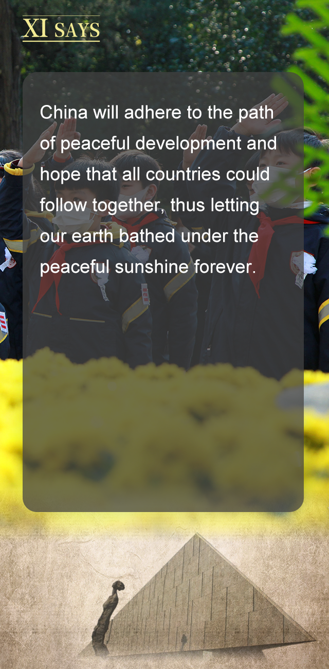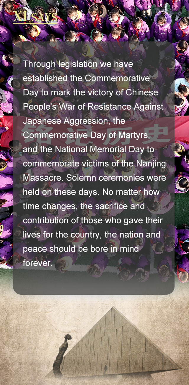 我们通过立法确定了中国人民抗日战争胜利纪念日、烈士纪念日、南京大屠杀死难者国家公祭日,举行了隆重活动。对一切为国家、为民族、为和平付出宝贵生命的人们,不管时代怎样变化,我们都要永远铭记他们的牺牲和奉献。