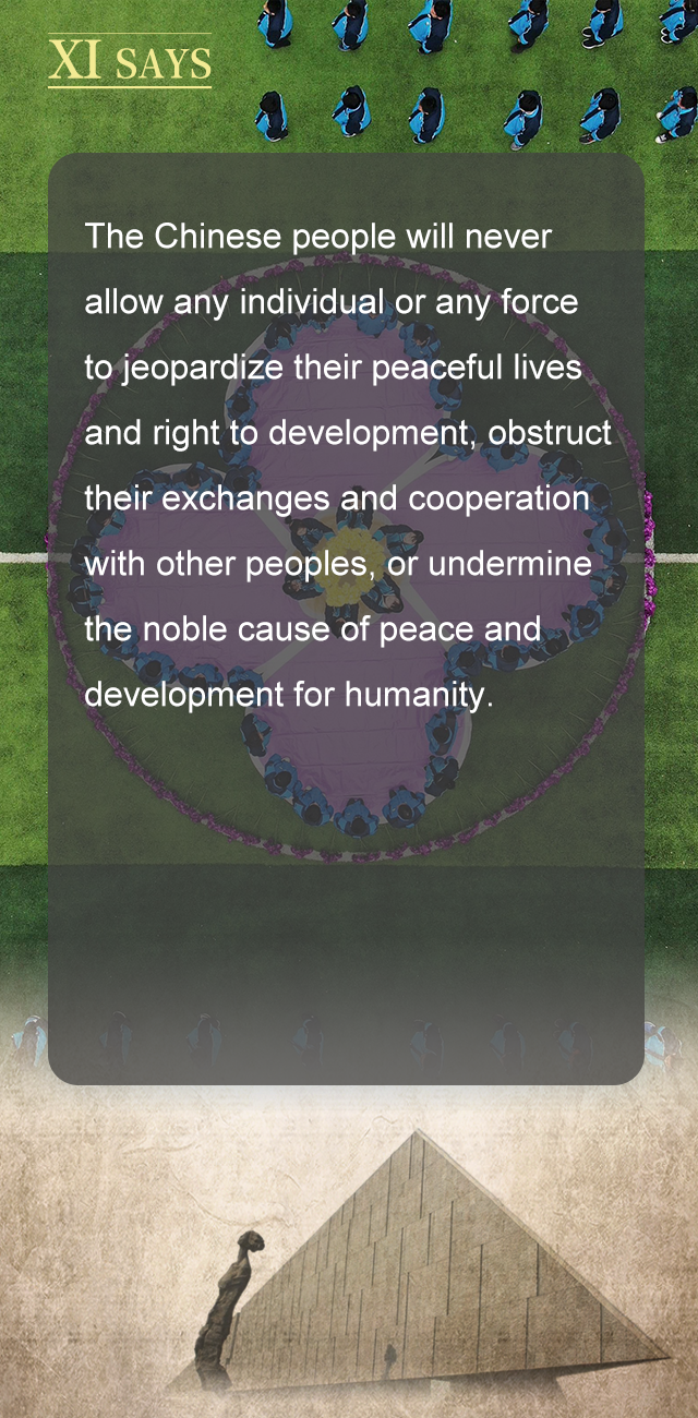任何人任何势力企图破坏中国人民的和平生活和发展权利、破坏中国人民同其他国家人民的交流合作、破坏人类和平与发展的崇高事业,中国人民都绝不答应!