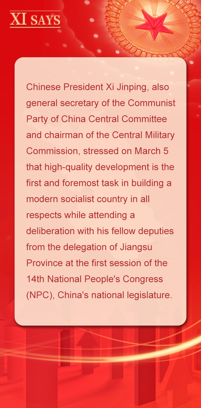 中共中央总书记、国家主席、中央军委主席习近平3月5日下午在参加他所在的十四届全国人大一次会议江苏代表团审议时强调,高质量发展是全面建设社会主义现代化国家的首要任务。