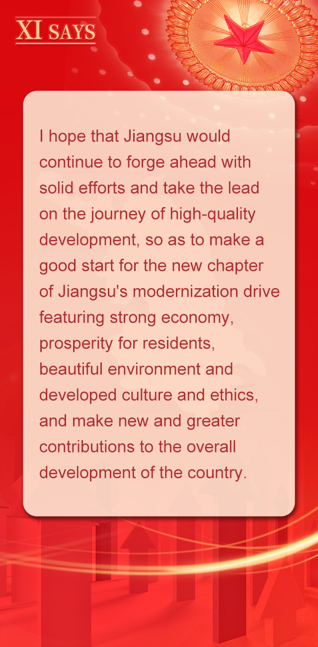 希望江苏继续真抓实干、奋发进取,在高质量发展上继续走在前列,为谱写“强富美高”新江苏现代化建设新篇章实现良好开局,为全国大局作出新的更大贡献。
