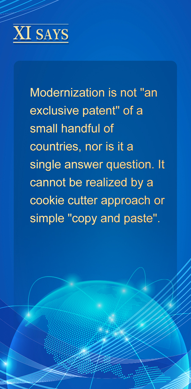 现代化不是少数国家的“专利品”,也不是非此即彼的“单选题”,不能搞简单的千篇一律、“复制粘贴”。