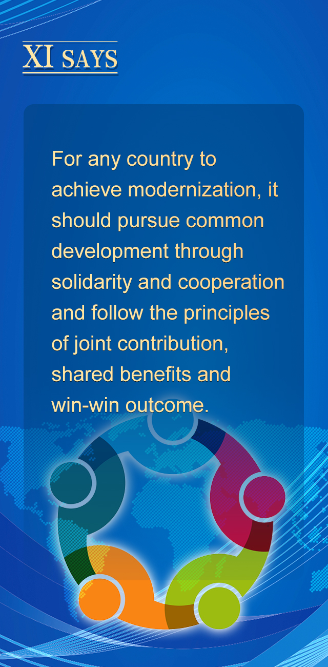 任何国家追求现代化,都应该秉持团结合作、共同发展的理念,走共建共享共赢之路。