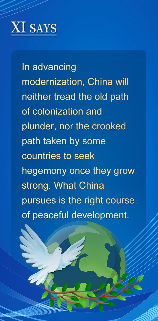中国式现代化不走殖民掠夺的老路,不走国强必霸的歪路,走的是和平发展的人间正道。