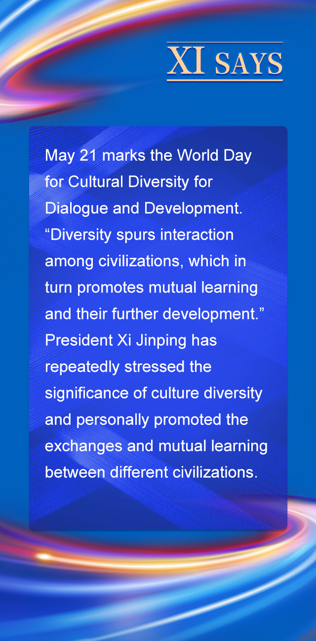 5月21日是世界文化多样性促进对话和发展日。“文明因多样而交流,因交流而互鉴,因互鉴而发展。”习近平主席多次阐述重视文化多样性的重要意义,亲自推动不同文明的交流交融、互学互鉴。