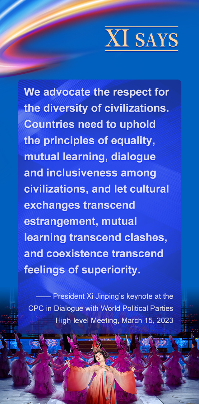 我们要共同倡导尊重世界文明多样性,坚持文明平等、互鉴、对话、包容,以文明交流超越文明隔阂、文明互鉴超越文明冲突、文明包容超越文明优越。