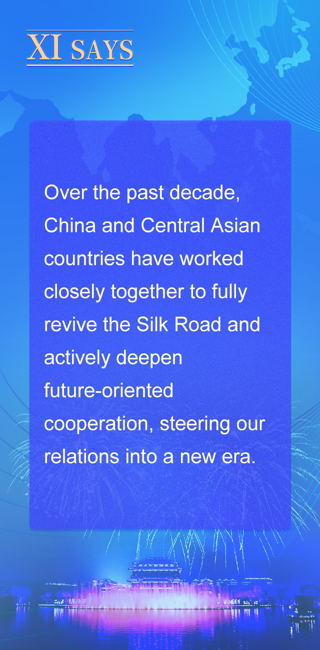 10年来,中国同中亚国家携手推动丝绸之路全面复兴,倾力打造面向未来的深度合作,将双方关系带入一个崭新时代。