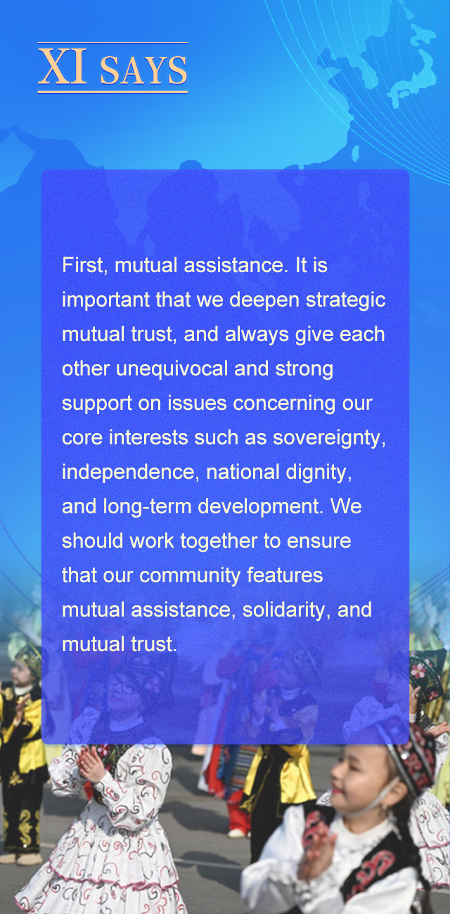 一是坚持守望相助。我们要深化战略互信,在涉及主权、独立、民族尊严、长远发展等核心利益问题上,始终给予彼此明确、有力支持,携手建设一个守望相助、团结互信的共同体。