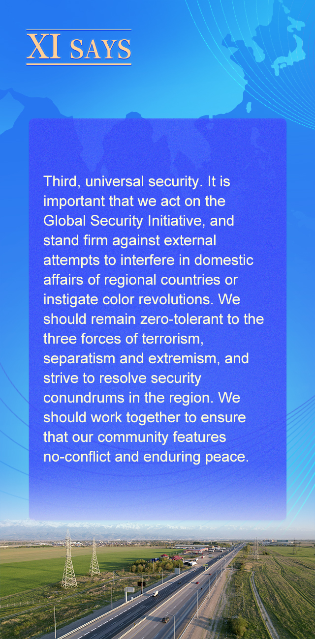 三是坚持普遍安全。我们要共同践行全球安全倡议,坚决反对外部势力干涉地区国家内政、策动“颜色革命”,保持对“三股势力”零容忍,着力破解地区安全困境,携手建设一个远离冲突、永沐和平的共同体。
