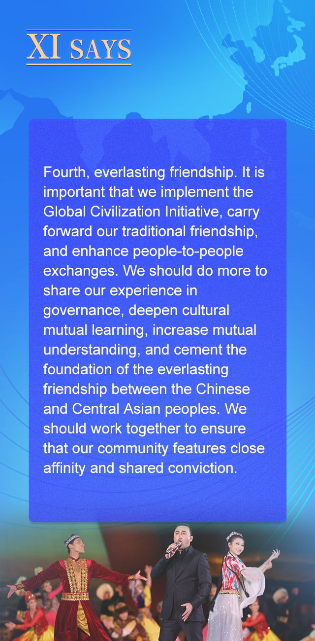 四是坚持世代友好。我们要践行全球文明倡议,赓续传统友谊,密切人员往来,加强治国理政经验交流,深化文明互鉴,增进相互理解,筑牢中国同中亚国家人民世代友好的基石,携手建设一个相知相亲、同心同德的共同体。