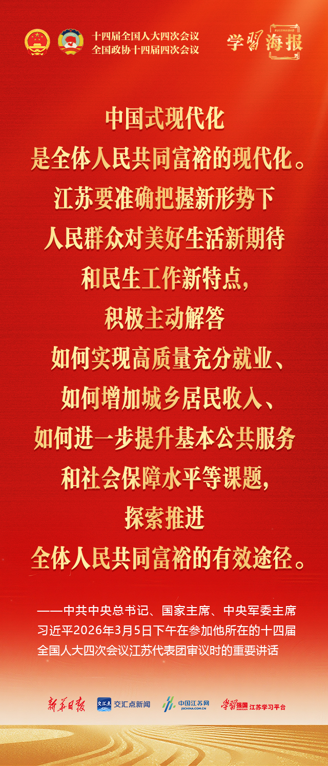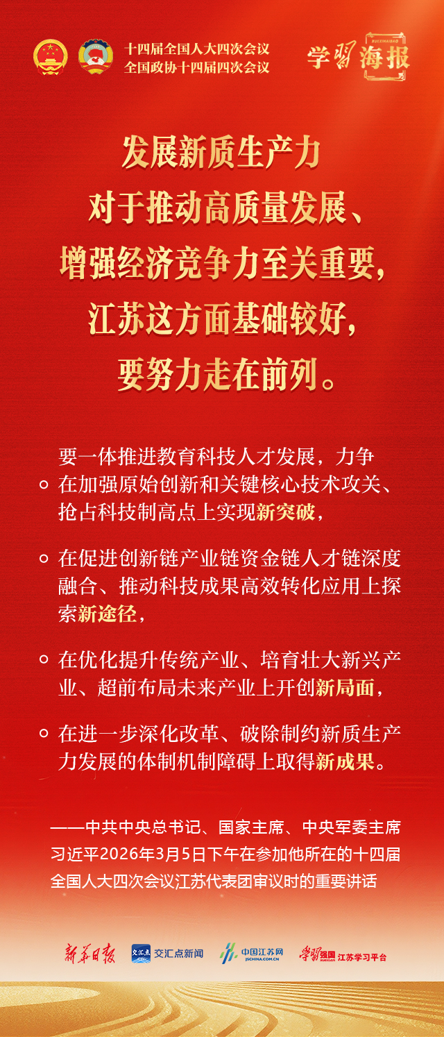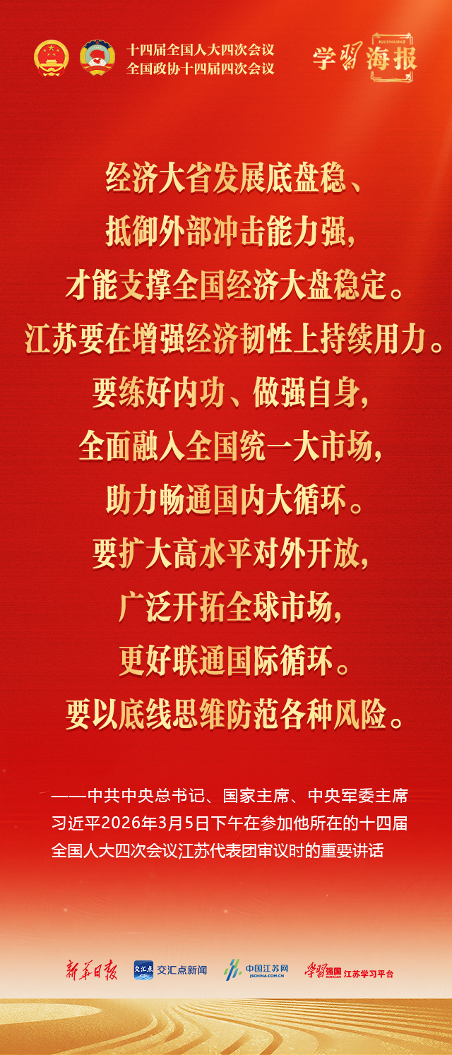 中共中央总书记、国家主席、中央军委主席习近平3月5日下午在参加他所在的十四届全国人大四次会议江苏代表团审议时强调,完成“十五五”经济社会发展目标任务,需要应对更加复杂的环境、解决更多深层次矛盾。江苏等经济大省处在改革开放前沿,要在研究新情况、解决新问题上下功夫、出经验。