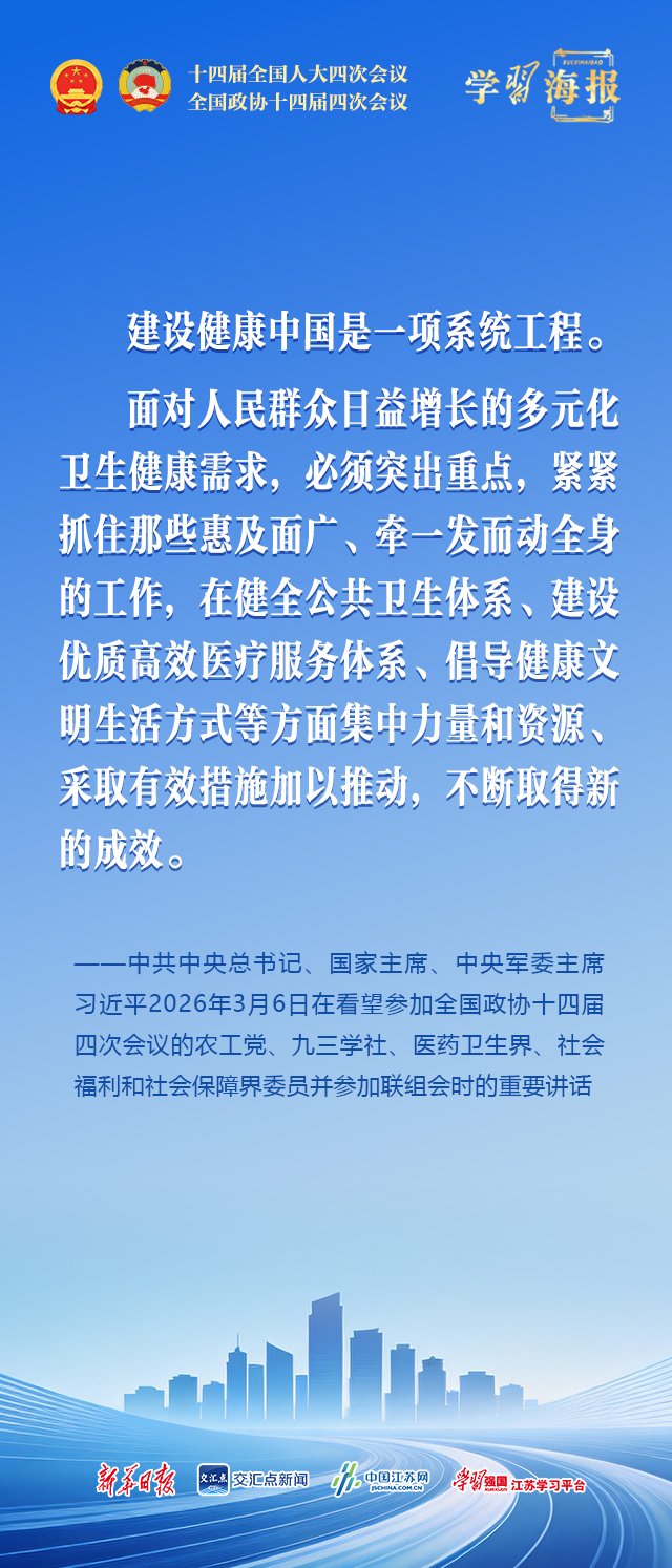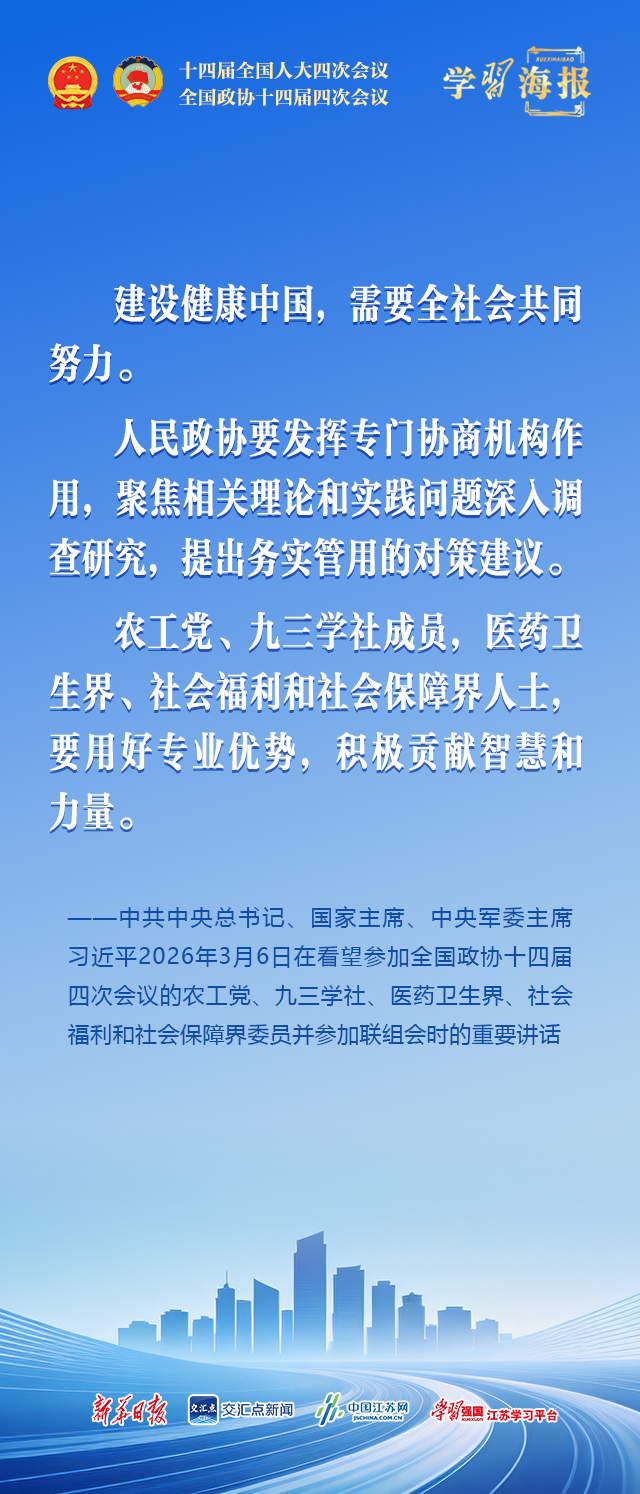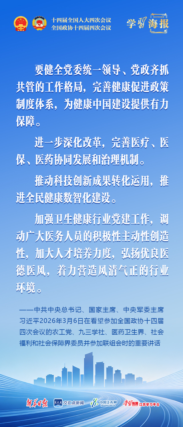中共中央总书记、国家主席、中央军委主席习近平3月6日下午看望了参加全国政协十四届四次会议的农工党、九三学社、医药卫生界、社会福利和社会保障界委员,并参加联组会,听取意见和建议。他强调,到2035年建成健康中国是中共中央作出的一项战略决策,“十五五”是实现这一目标的关键时期,必须统筹谋划、加紧推进,力求取得决定性进展。