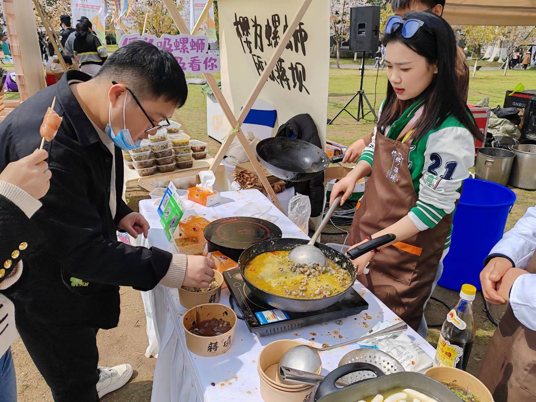 当天活动以“樱为螺蛳,所以蒋坝”为主题,结合玄武湖樱花节活动,融入螺蛳美食、非遗文化、文创潮玩等,现场推出麻辣、蒜香等6种口味的螺蛳,吸引众多游客,仅开市首日上午就售出螺蛳2000余斤。