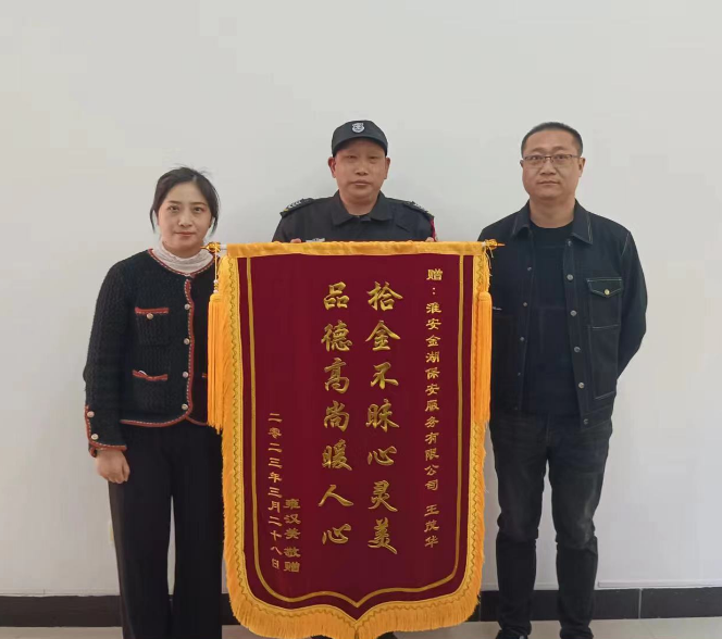 中国江苏网4月6日淮安讯 近日,在淮安金湖保安服务有限公司出现感人一幕:只见一位女同志将一面写有“拾金不昧心灵美,品德高尚暖人心”的锦旗送到保安王茂华的手中,感谢他拾金不昧,让自己丢失的钱包失而复得。