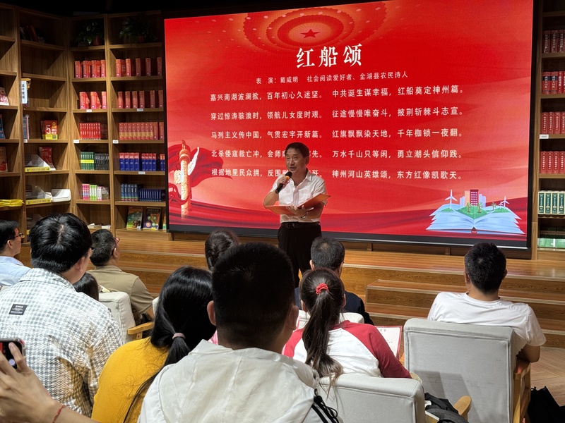 这场以 “书香城韵・阅向未来” 为主题的中华经典散文诗词歌赋诵读荟,在四位小学生带来的散文《闪闪的红星》诵读表演中拉开序幕。金湖县融媒体中心播音员万晓航深情诵读《我骄傲,我是中国人》,赢得现场阵阵掌声;金湖县社会阅读爱好者、农民诗人戴咸明带来诗歌《红船颂》,让现场观众感受到开天辟地的首创精神。
