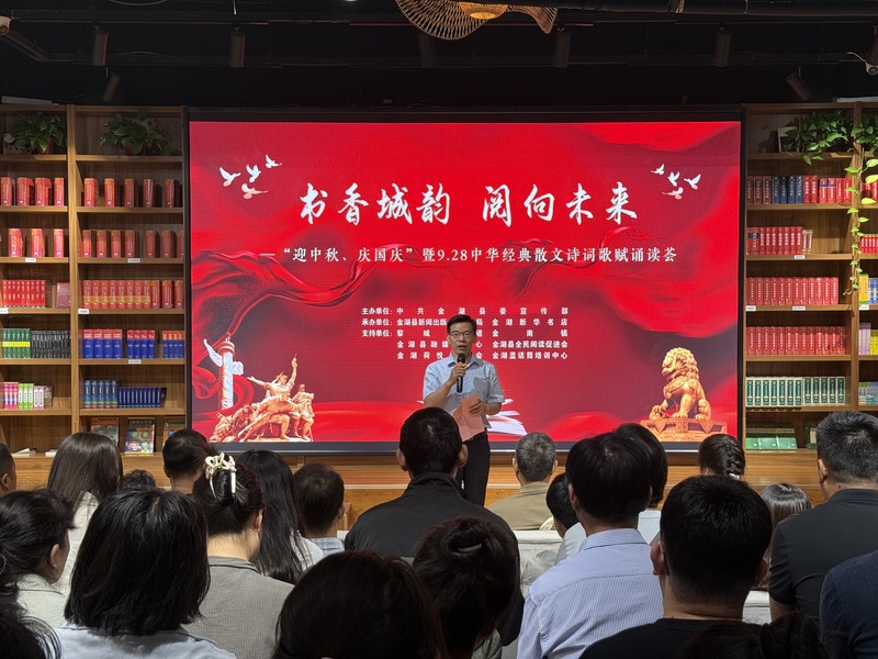 9 月28日,金湖县在金湖新华书店举办 “迎中秋・庆国庆”暨9月28日中华经典散文诗词歌赋诵读荟,来自各镇(街)的农家书屋管理员、阅读爱好者代表等齐聚一堂,分享中华经典诗词散文歌赋的魅力,致敬英雄、缅怀先烈、启迪未来。
