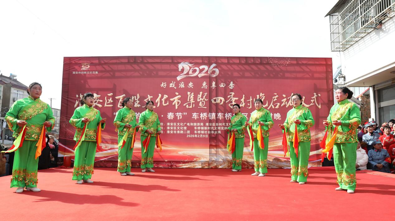 咚咚锵!咚咚锵! 2月9日,一阵急促欢快的锣鼓声在淮安市淮安区车桥镇馄饨街响起,由区文广旅游局、区新时代文明实践中心联合主办,以“我们的节日·春节”为主题,融非遗展示、民俗表演、美食推广、文艺汇演于一体的淮安区“百姓文化市集”暨“四季村晚”活动正式拉开帷幕,为当地群众带来了一场充满年味与文化气息的新春盛宴。