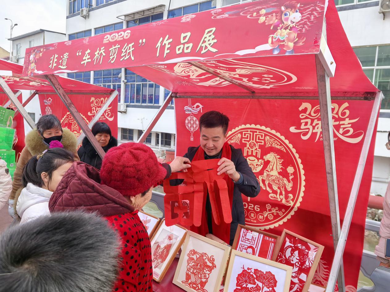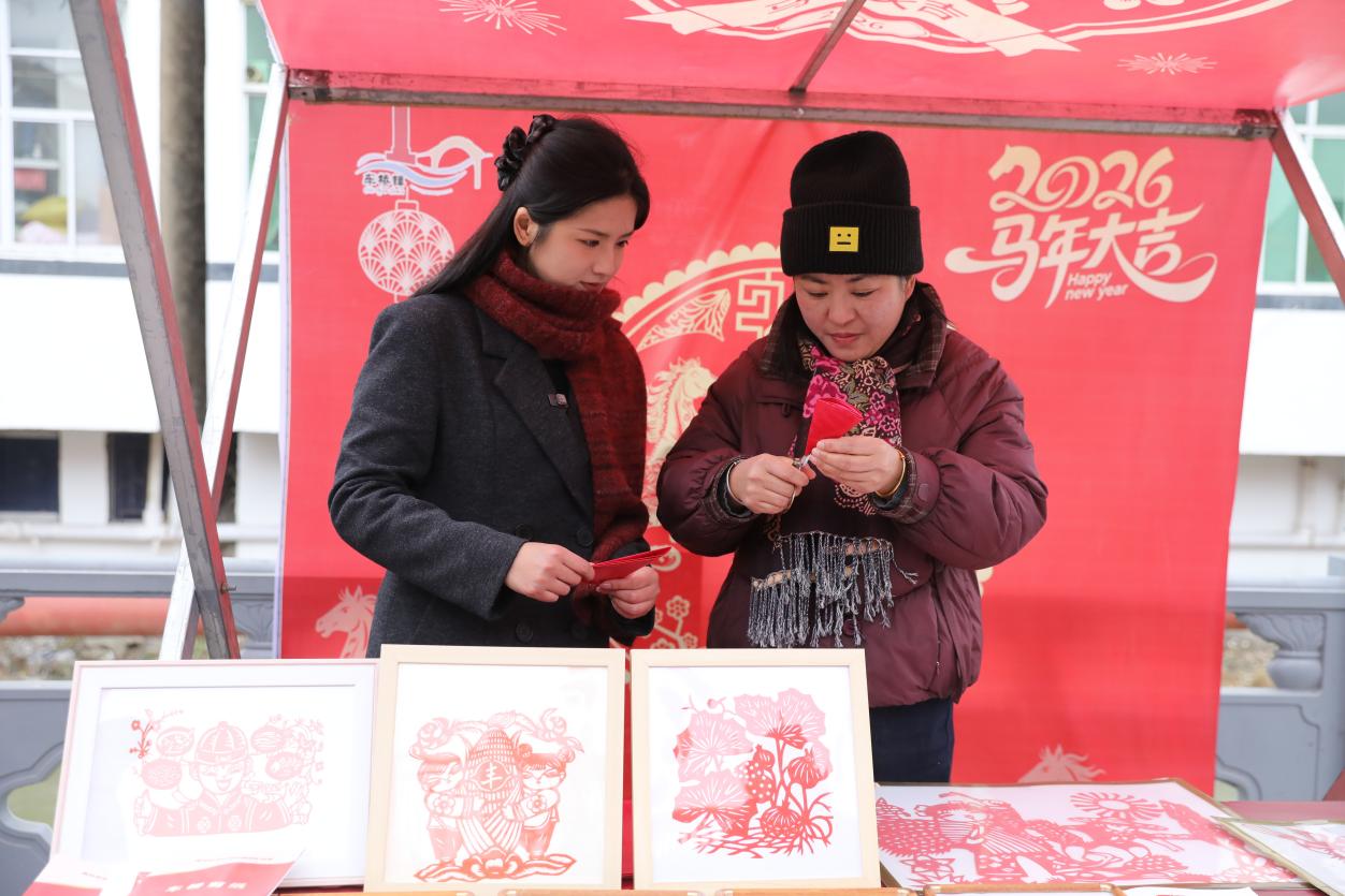 活动现场,10余个特色摊位一字排开,每个摊位前都挤满了群众。在非遗展位,车桥剪纸非遗传承人崔小勇端坐台前,银剪在红纸上灵巧翻飞,转、折、剪、刻一气呵成,不过三分钟,一匹昂首奔腾的“骏马”便跃然纸上,引得围观群众阵阵喝彩。除了马年主题剪纸外,各种寓意吉祥的窗花、福字也是分外喜庆,吸引了众多群众选购。“过年了嘛,买一些福字带回家,把福气也带回家!”村民马敏敏笑着说。