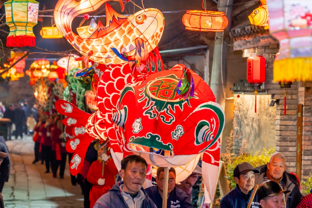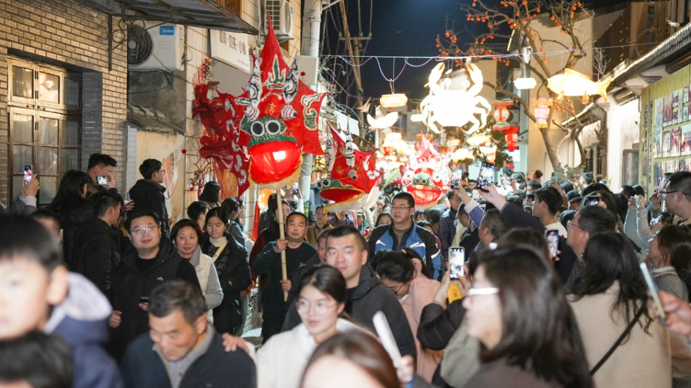 当地特色鱼灯巡游队伍走上街巷,五彩斑斓的鱼灯在夜色中流光溢彩,格外夺目。空中同步上演西游主题“凤凰飞天”光影特效,地面巡游与空中光影遥相呼应,游客们掏出手机拍照录像。