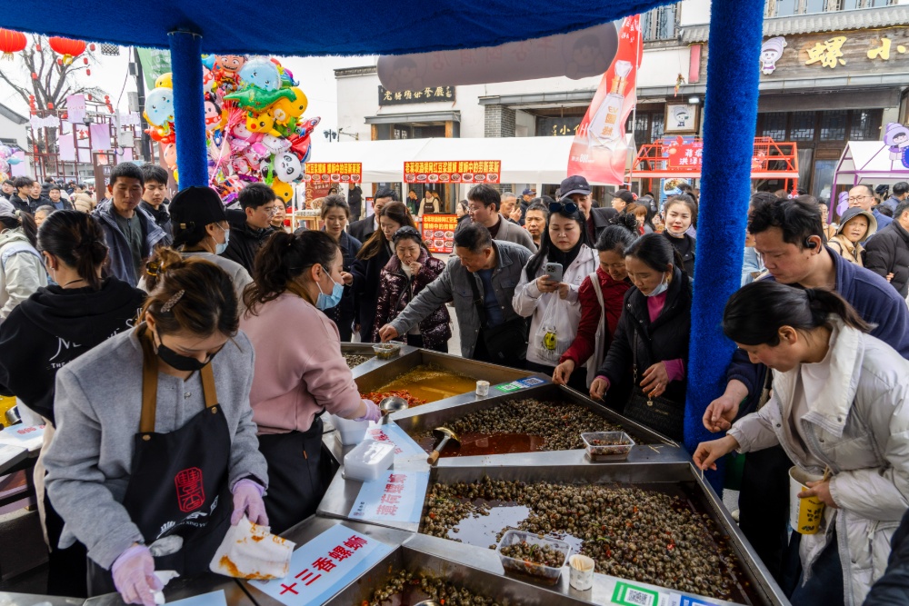 除了螺蛳作为核心特色,市集还同步设置非遗手工艺品展示区、本地农产品展销区、特色饮品与风味小吃区,业态丰富多元。游客们一边漫步街巷品尝美食,临走时还能选购地道土特产,沉浸式感受古镇春日烟火。