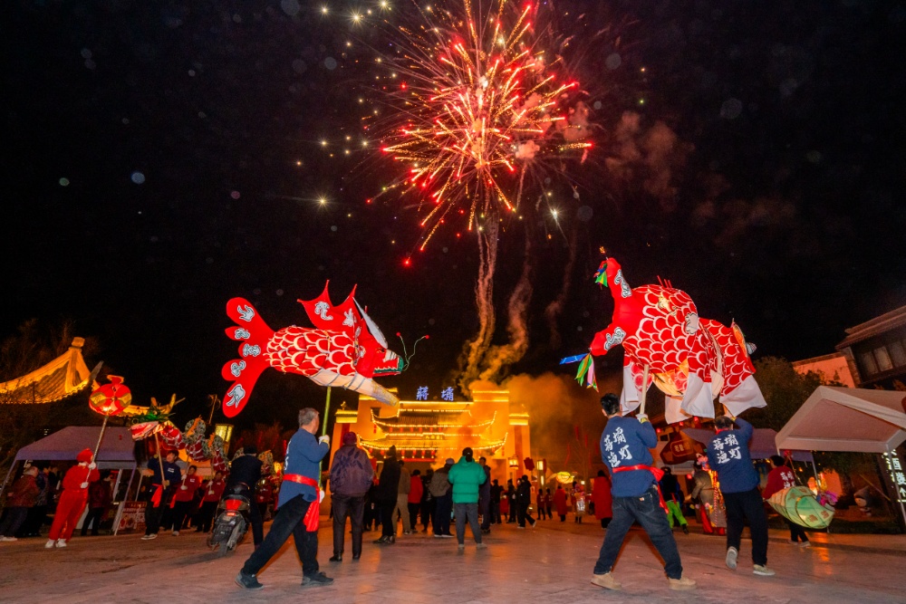 无人机编队腾空升空,在夜空精准拼出“螺小妹、鱼小圆”IP形象,以及“世界那么大,欢迎来蒋坝”“2026蒋坝螺蛳美食旅游季”等字样与图案,水上火壶表演、非遗打铁花轮番上演,打铁花火星四溅、气势磅礴。夜色中的蒋坝,既保留了千年古镇的传统韵味,又兼具现代光影的浪漫质感。