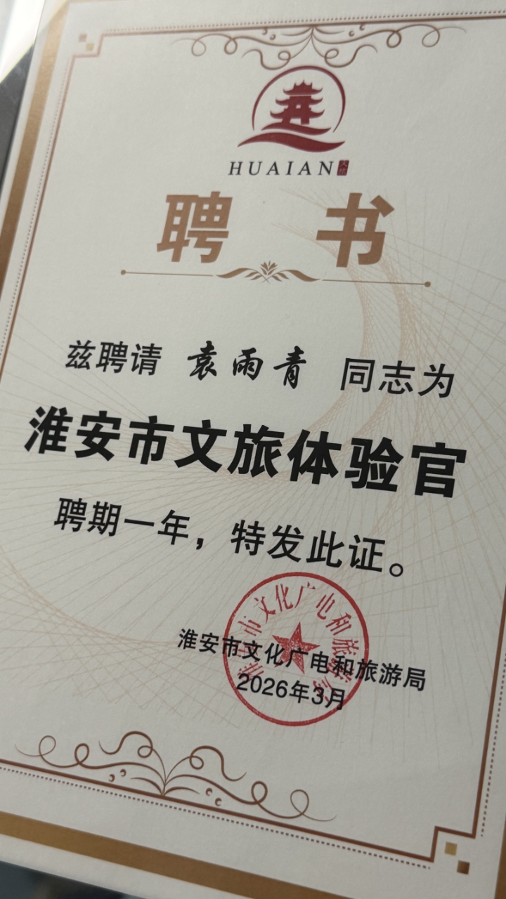 如今,袁雨青用镜头“拼”出的洪泽文旅画卷,已被更多人看见。“淮安印象”账号全网累计收获60多万粉丝,全年浏览量突破2亿,多条作品被新华社、中国记协等权威平台转载,其中《世界赠予我的》(洪泽文旅版)更是斩获淮安市“百里画廊”短视频大赛一等奖,成为洪泽文旅最亮眼的“名片”。这份坚守也收获了认可:2024年,袁雨青被聘为“洪泽文旅推荐官”;2025年12月,荣立“三等功”;2026年3月,被聘为“淮安市文旅体验官”。(王生标)