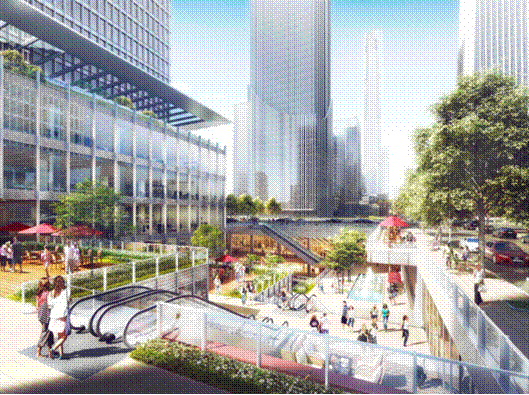 在地下六七层的轨道交通层,将规划4条轨道线,分别为地铁4号线、11号线、13号线和15号线,形成一个井字形结构。这里共设置2站,每个站可以实现3条轨道交通换乘。人们可以自由换乘,下车后,即可通过电梯进入购物层、休闲层等区域。