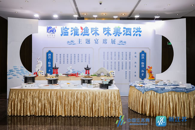 鲜美的鱼肉蘸着浓郁的汤汁,让人垂涎的尺半强鲜香味扑鼻而来;伴着葱姜的带刺鱼丸,一口咬下去既鲜嫩又口感丰富;与众不同的菱角秧包子,吃到的是大自然的味道……世代生活在泗洪这片土地上的人们获得了诸多自然的馈赠,在匠人的精心烹调下,又变成一道道洪泽湖畔美味佳肴。在推介会现场,由芡实梗烧鲢鱼、酒糟青鱼块、金玉尺半强等渔家菜组合的泗洪·临淮十味以及卤水老豆腐、生炒鼎湖蔬、荷香酒糟蟹、姜汁炖水鱼组成的泗洪·临淮渔宴进行了现场品鉴。同时,“蟹园”牌泗洪大米、泗洪大闸蟹、泗洪小龙虾、洪泽湖芡实、洪泽湖莲子等具有地方特色的农副产品以及“临淮渔味 味美泗洪”部分预制菜也在现场展出。