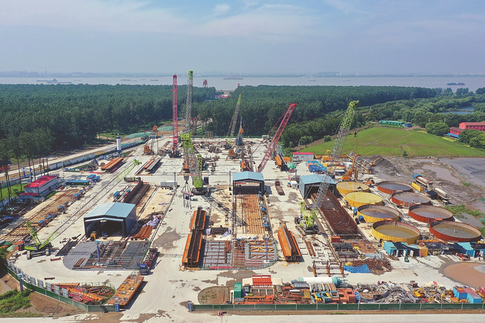 张靖皋长江大桥南航道桥北锚碇、北主塔建设现场。朱其 摄
