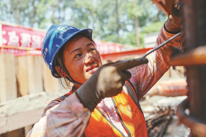 上午10:00,工地上所有的钢板都晒得烫手。在这里,建筑女工张莉正踩在钢筋笼中,熟练地用钢丝将立起来的钢筋绑扎、扭紧,不断加高。这个动作,张莉每天要重复上千次。