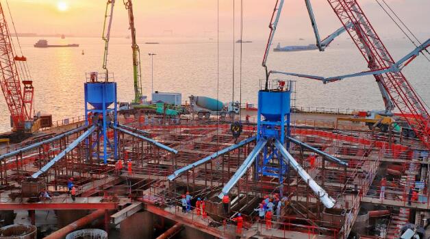 张靖皋长江大桥南航道桥南主塔高350米,南主塔承台平面为八边形结构,长105.2米、宽43.6米、高8.5米。承台围护结构采用桩长37米的锁扣钢管桩围堰,围堰作为临时施工围水设施,兼具永久冲刷防护和船撞消能作用。封底混凝土沿承台外侧边缘外扩1.5米进行浇筑,封底厚度为2.8米,两侧共需浇筑水下混凝土1.1万余立方米。封底分两次浇筑,本轮首次完成下游侧混凝土浇筑约5500立方米,上游侧混凝土浇筑施工预计8月底全部完成。浇筑过程中,项目部采用4台泵车、2台履带吊、1台汽车吊作业,组织现场80余名作业人员昼夜交替排班、挂图作战,确保了下游侧封底混凝土优质高效浇筑完成。