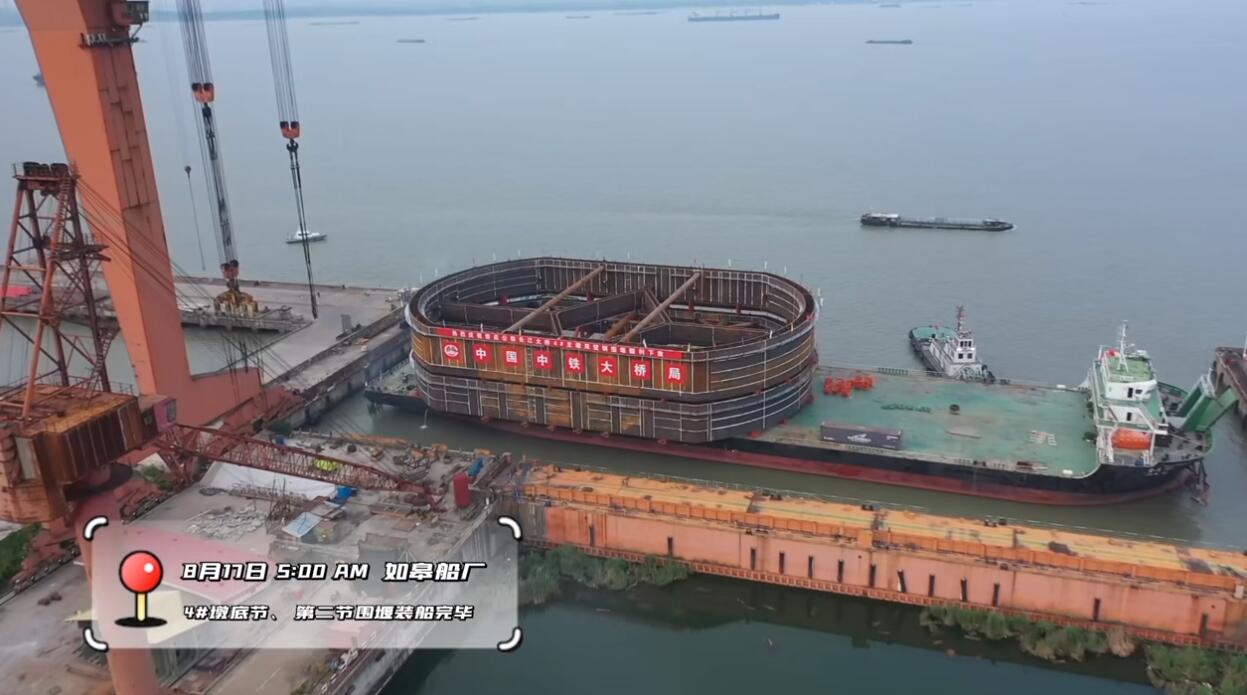 崇启长江公铁大桥是世界在建最大跨度公铁两用无砟轨道斜拉桥,4号主墩钢围堰设计为非标准圆端型双壁钢套箱结构,长72.7米,宽47.45米,高24.68米,总重约2650吨,共分成4节运输和安装,将为桥墩施工提供有力的围护保障。