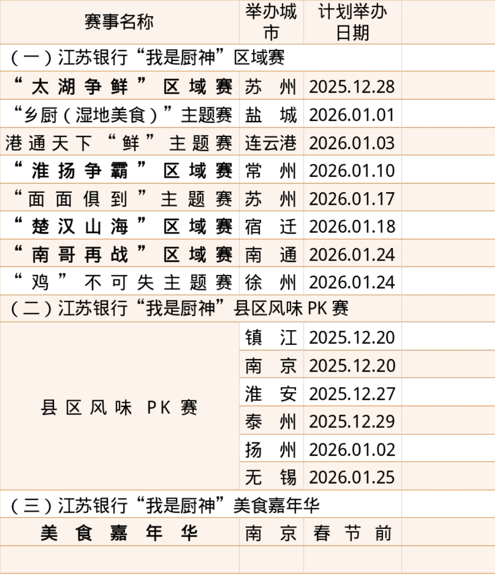 记者了解到,后续淮安、泰州、扬州等多地赛事将陆续开擂,更多精彩活动与福利详情可关注官方发布,共同见证江苏“厨神”诞生,品味舌尖上的幸福年味。