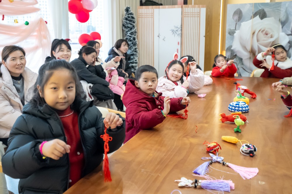 最受期待的创作环节中,活动现场设置两大体验区,家长与孩子分工协作、默契配合,沉浸式投入创作之中。糖画体验区里,孩子们在传承人指导下,小心翼翼握住盛满糖浆的铜勺,屏息凝神在石板上勾勒线条。彩线结艺体验区同样热闹温馨,彩色线绳在亲子指尖灵活穿梭,大家跟着传承人学习绕线、穿插、拉紧、收尾的关键步骤,从简单的平结入手,逐步尝试编织带有装饰性的手链、挂饰。