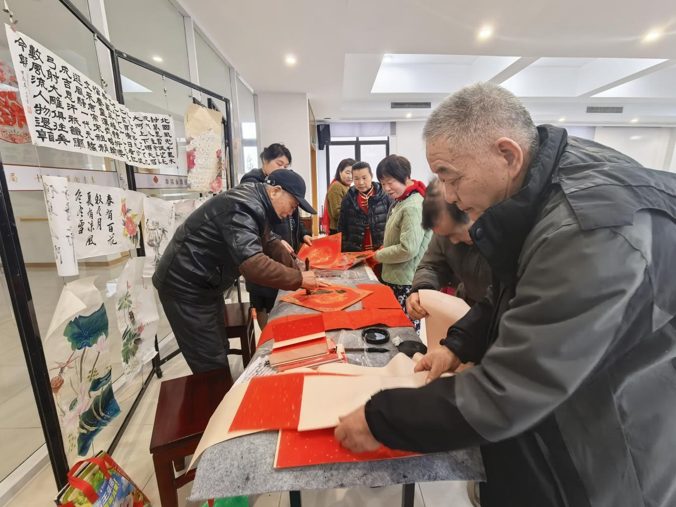 迎春联欢环节,各班学员纷纷登台,以歌舞表达对新年的期盼。现场同步开展了多种文化互动:书画班的学员挥毫写春联、送“福”字;编织班展示了手工作品并邀请居民体验;各班级学习成果以静态形式陈列,供人观看。现场还设有留言板,供学员和居民写下祝福与感言。