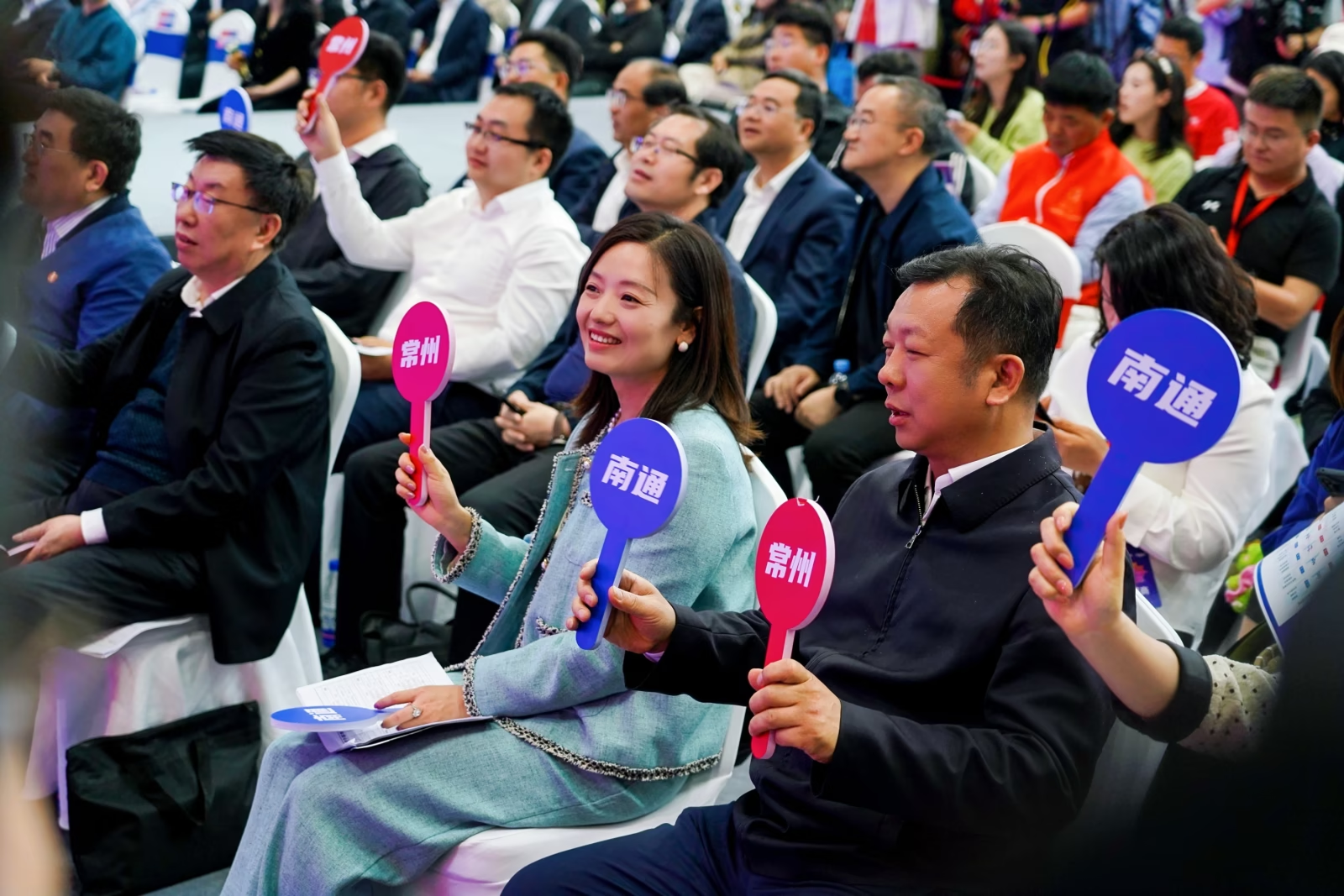揭幕战最大看点当属常州与南通双城PK。两地各派21家优质企业登台竞技,好物轮番亮相。黑牡丹的质感牛仔对阵华艺扎染的温婉雅致,刚柔之间尽展双城工艺;萝卜干炒饭的家常烟火遇上景福斋糕点的细腻香甜,一口解锁苏味本真;爱尔威智能行李箱的高效便捷对决喜腾箱包的轻巧灵动,彰显苏品的匠心与底气……台上,专业模特手持参赛好物展示,推荐官同步拆解其中的工艺亮点与创新之处。台下,9位专业评委与50位大众评委神情专注,随时准备为心仪好物举牌投票。一赛一评间,不仅让消费活力充分释放,也让“苏品苏货”的品牌影响力持续升温。