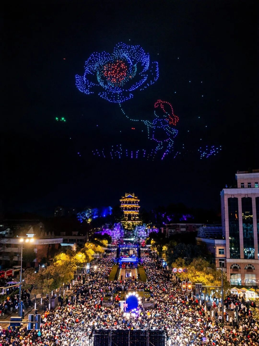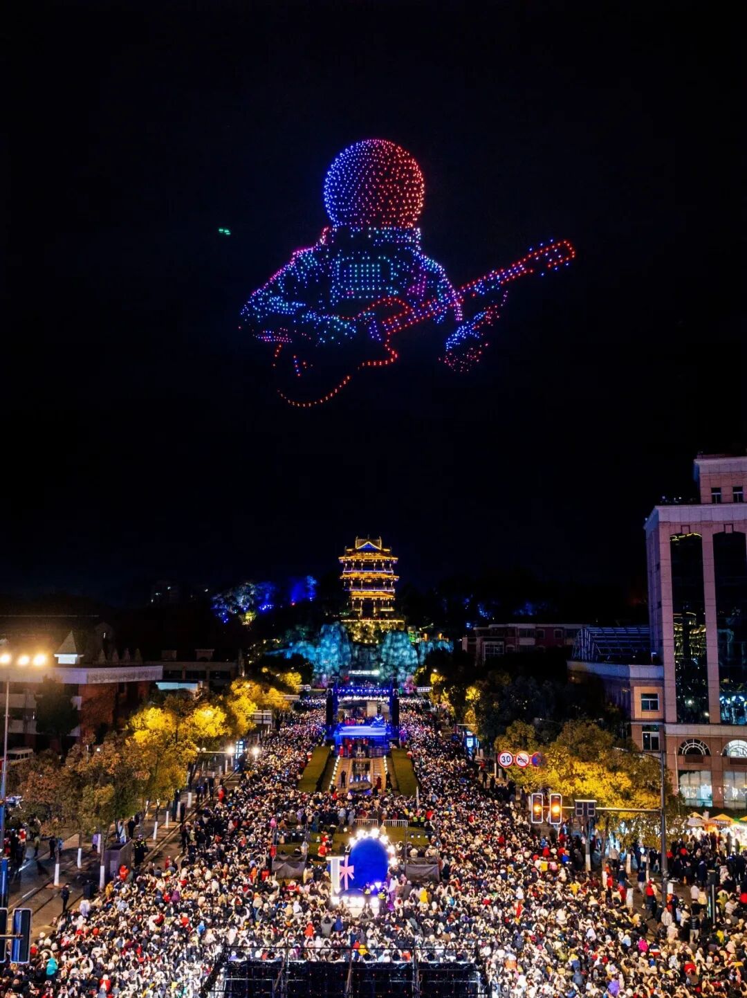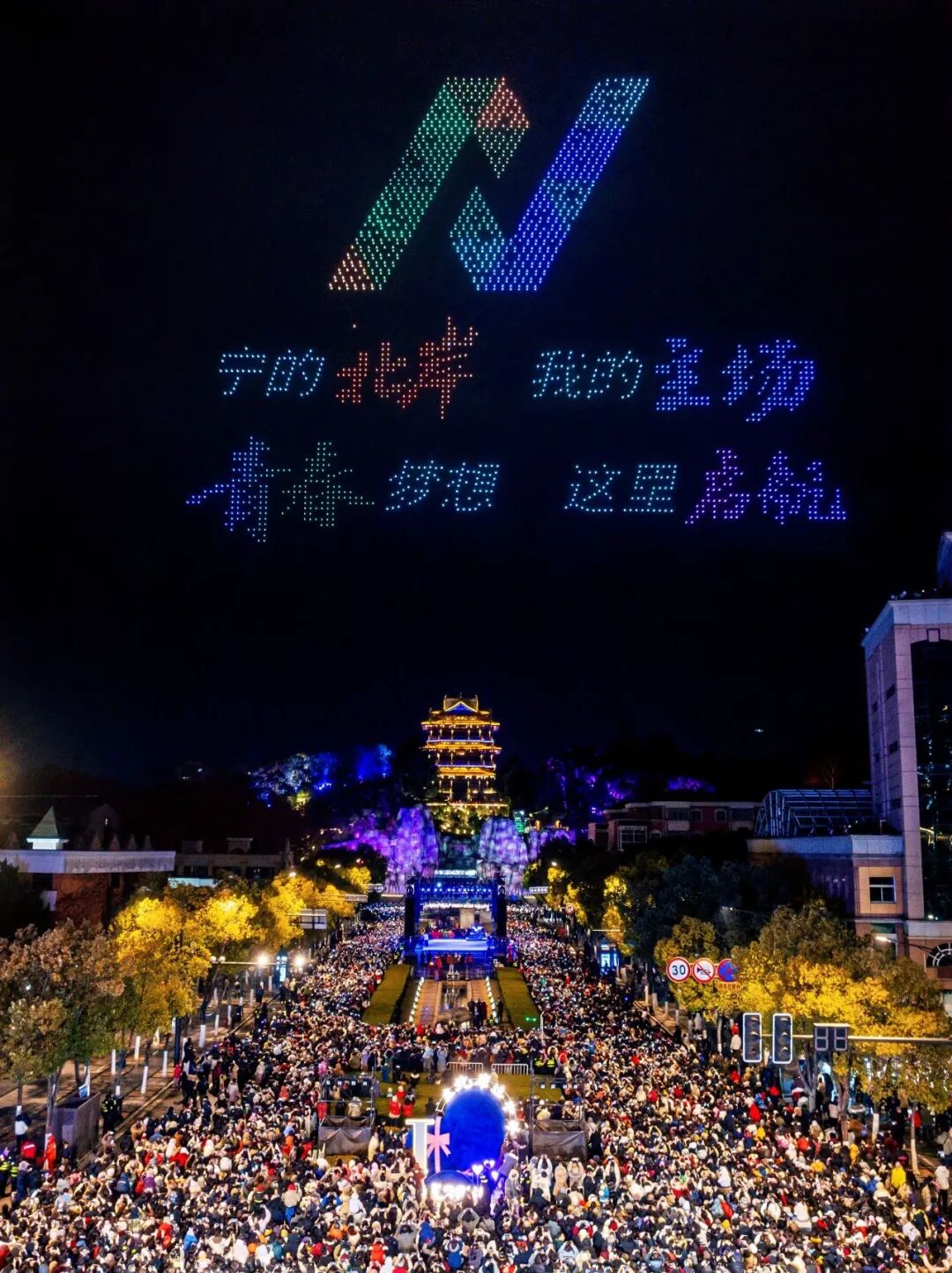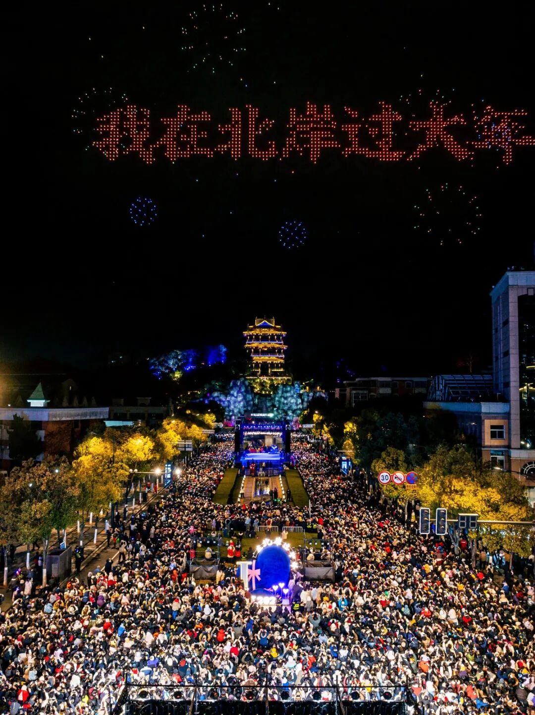 夜幕降临,万众期待的2026架无人机同步升空,“我在北岸过大年”“宁的北岸、我的主场”等字样闪亮出现,随后,无人机在空中有序变换出各种造型,形成夜空中璀璨的光影矩阵,搭配着激昂的歌曲,将现场氛围推向高潮。