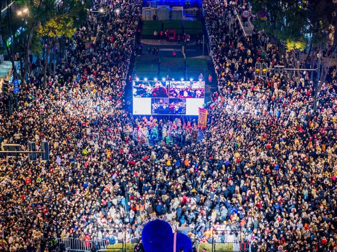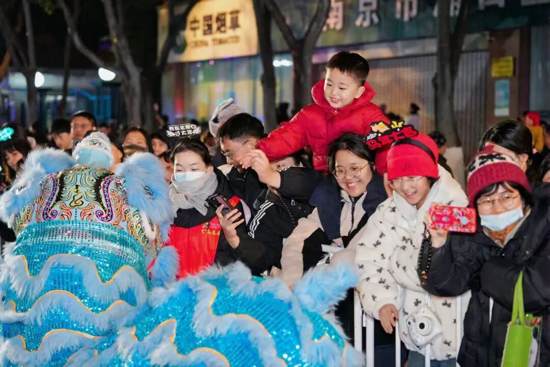 “快看!有那么多舞狮!”随着国潮醒狮的腾跃起舞,跨年盛宴在凤凰大街拉开帷幕。灵动的鱼灯沿着凤凰大道次第巡游,灯笼光影摇曳生姿;酷炫的赛博麒麟踏着动感节拍登场,传统韵味与未来科技感碰撞出别样火花,引得现场观众纷纷举起手机拍照记录。